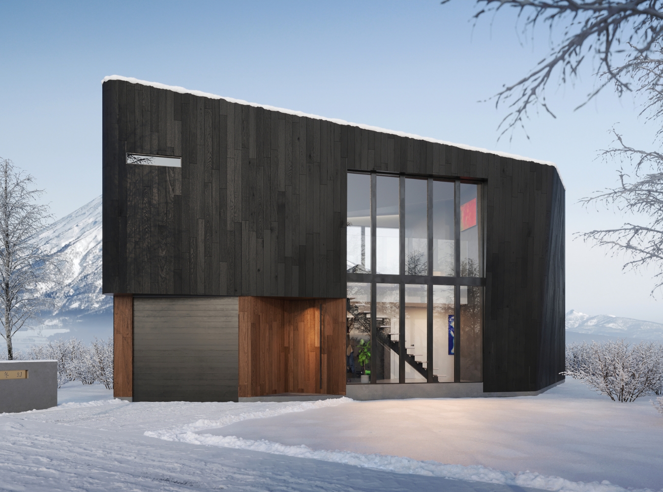 The name, Togen, is a beautiful Japanese homonym that means both winter field and winter illusion, and evokes a magical scene of dancing snow flurry that contrasts against the deep, charred facade of the homes.